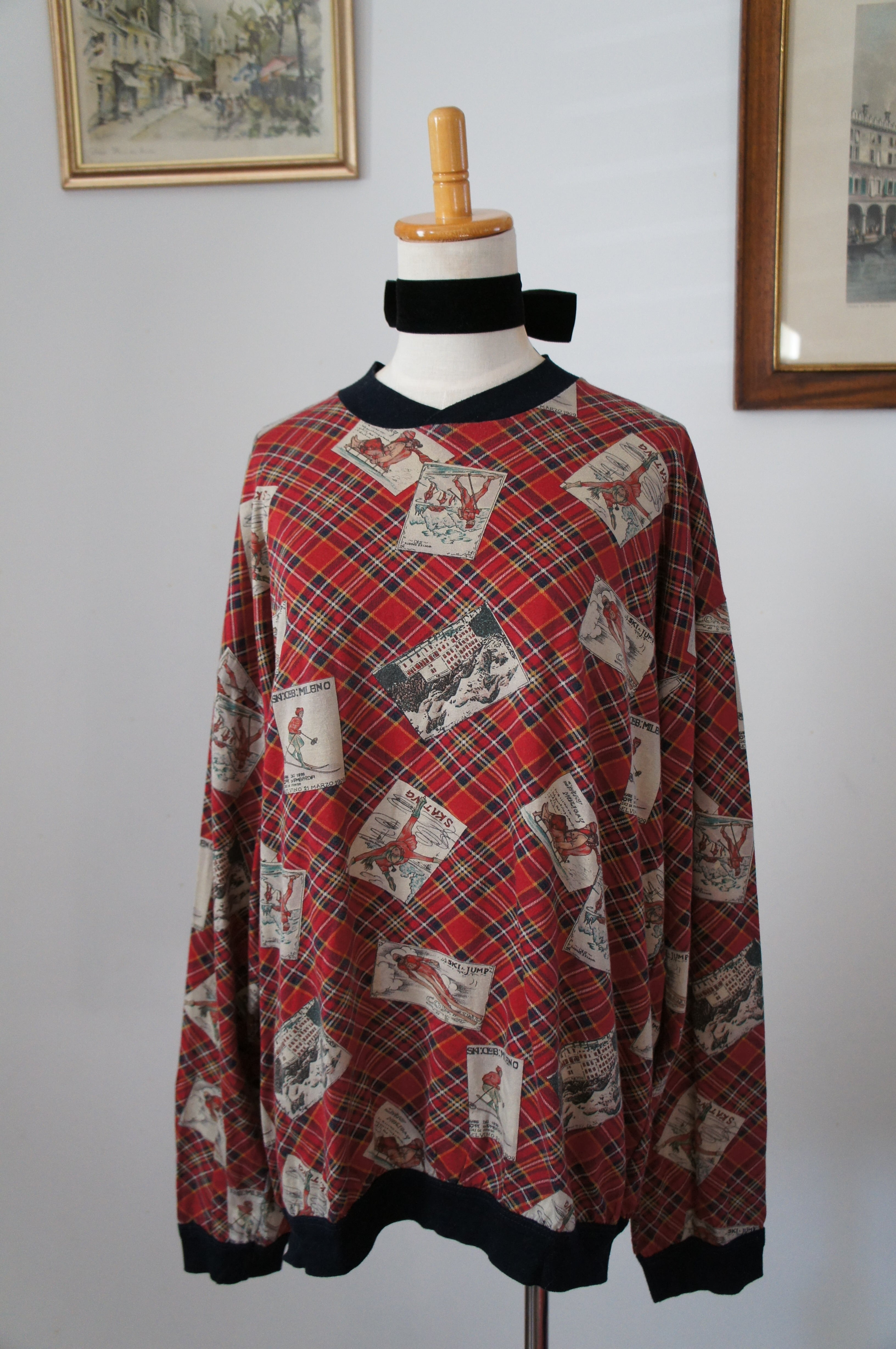 冬のヨーロッパの冬景色を思わせるイラストが散りばめられた、どこかノスタルジックで遊び心のあるカットソー。