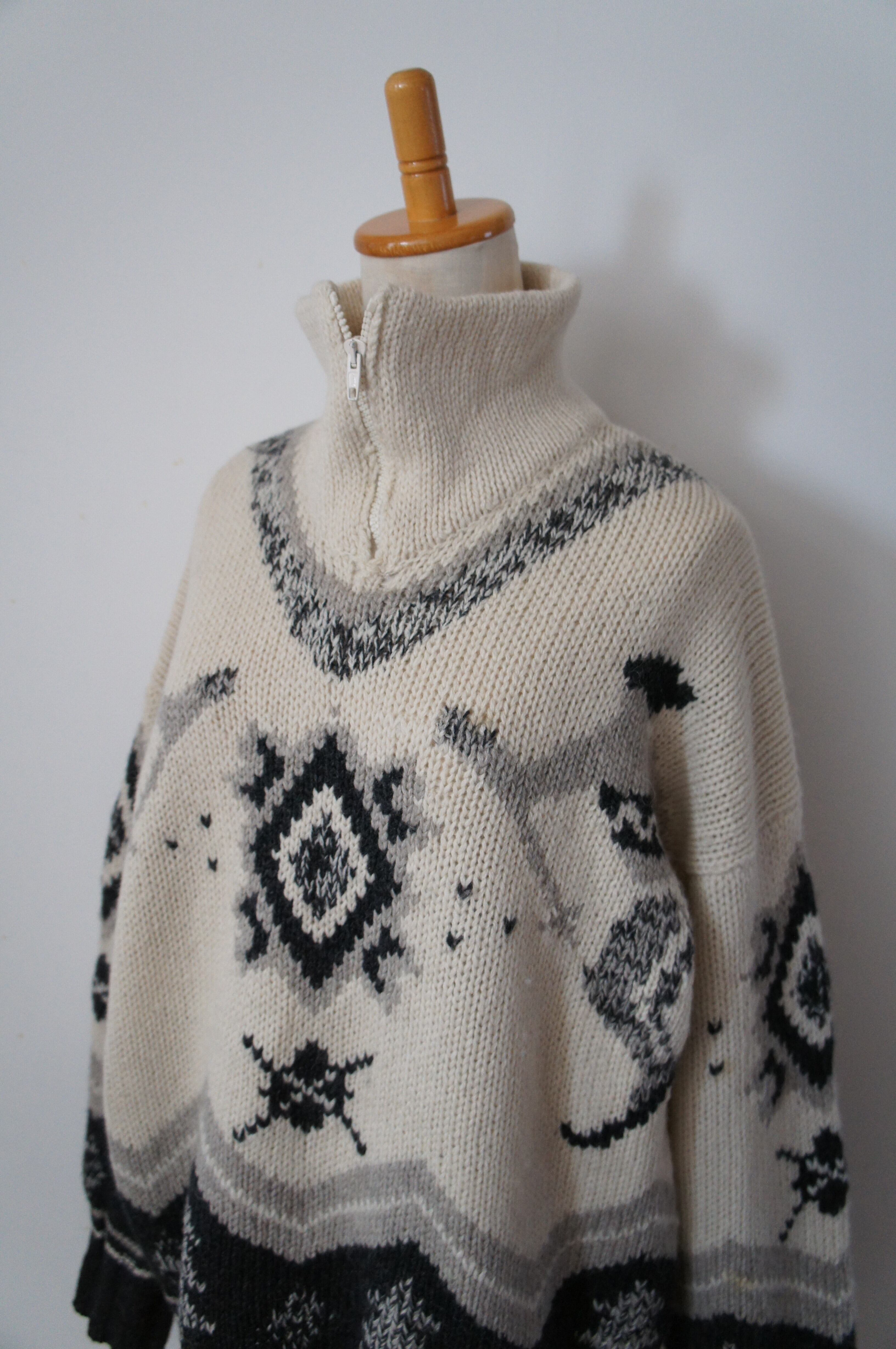 アイボリーをベースに、雪山やモチーフ柄がバランスよく編み込まれた一着です。